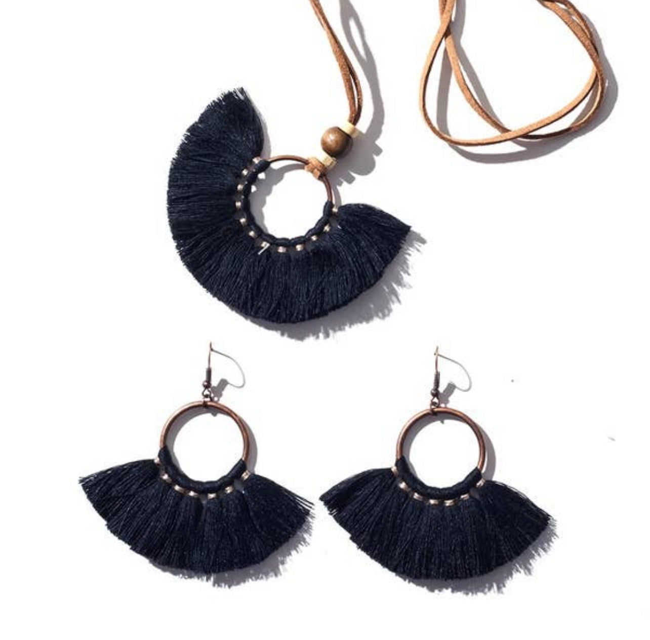 Earrings and necklace set in black. Earrings are drop earrings, approximately 2.75 inches. Necklace on suede lace approximately 28 inches.