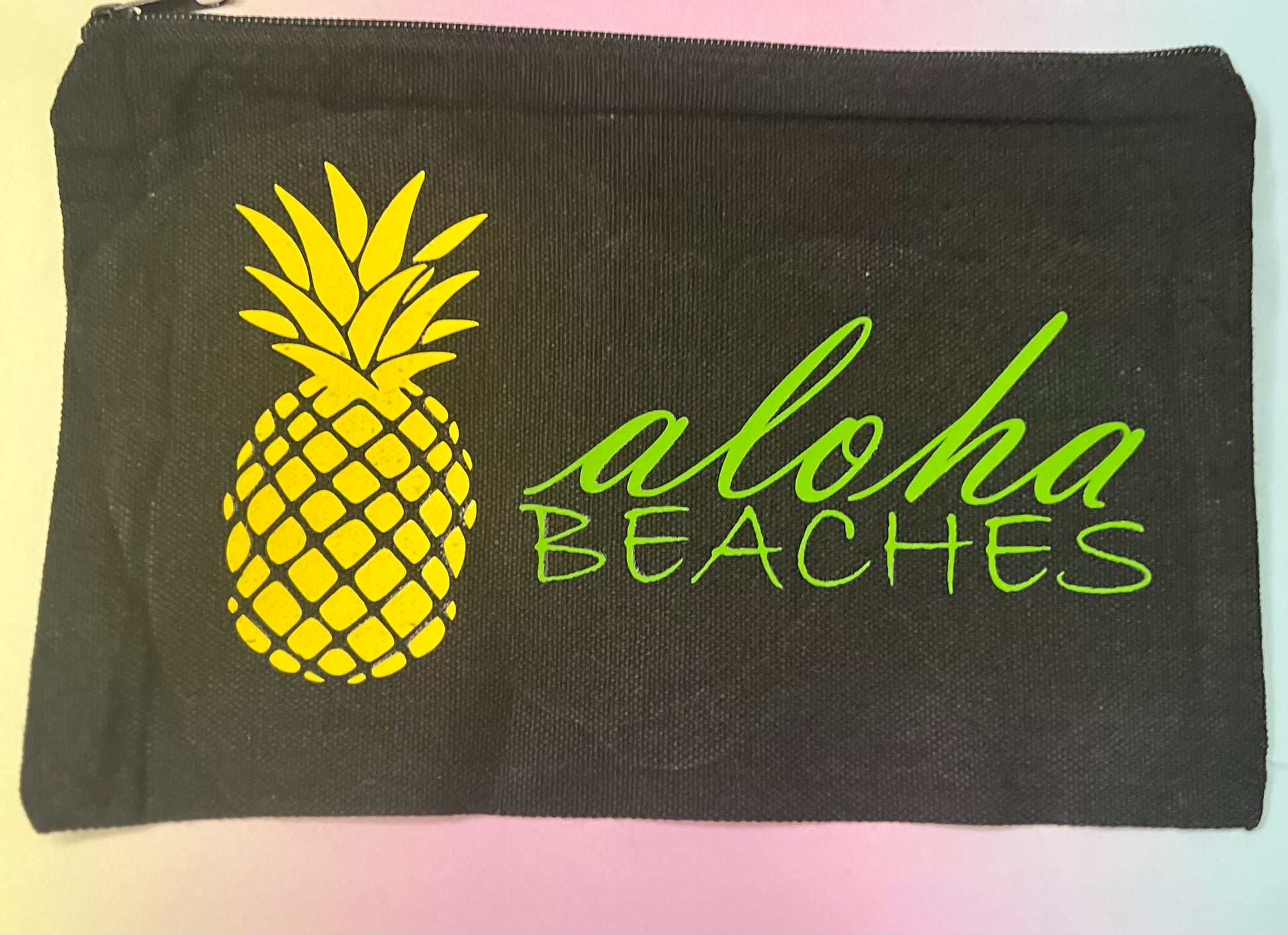 Pack your getaway goodies with "aloha BEACHES"! This small canvas bag (8.3 x 5) is the perfect size for holding your essential travel toiletries, makeup, and other personal items - it'll feel right at home in your carry-on, suitcase, or purse. Rock that beach look and go with a bag that says "aloha"!