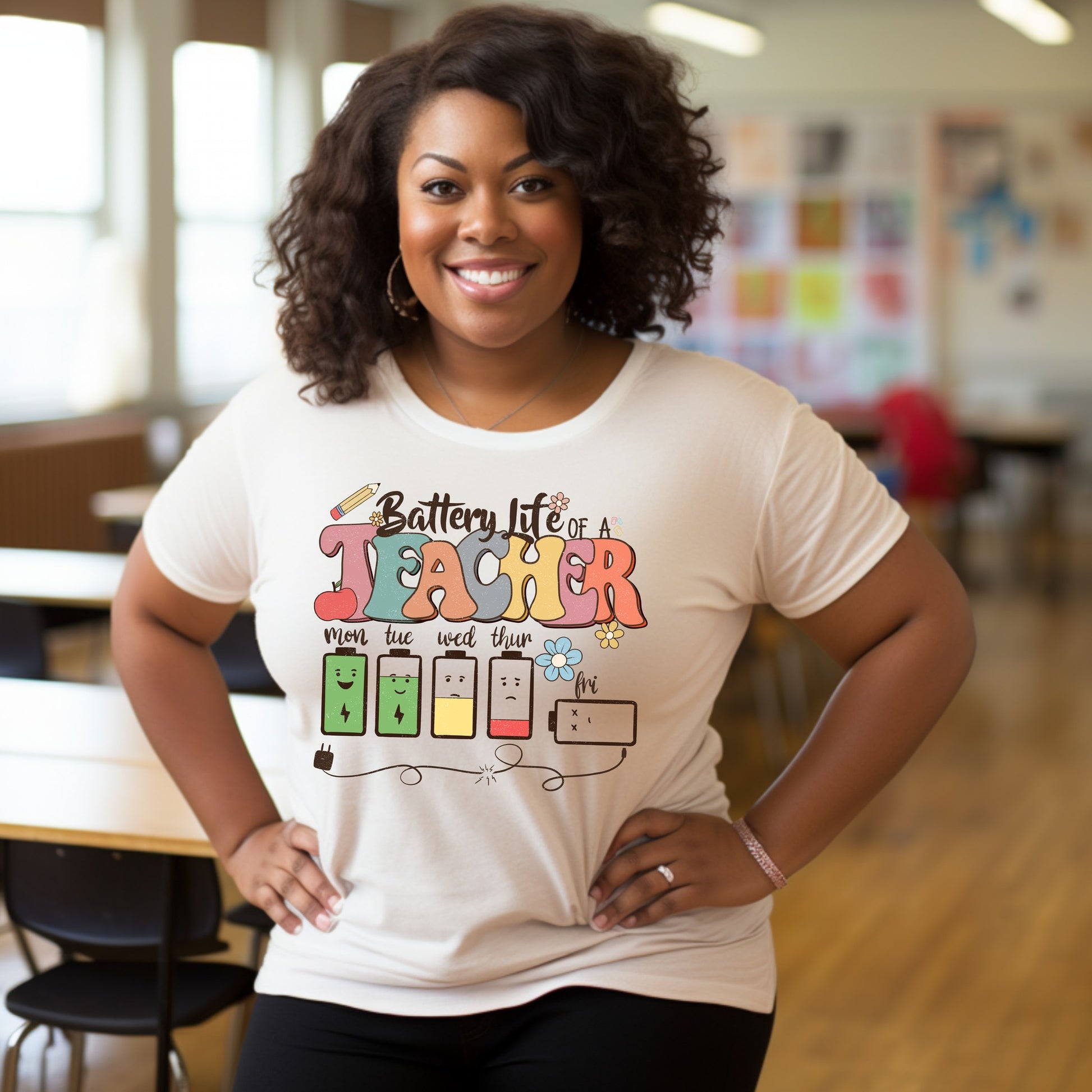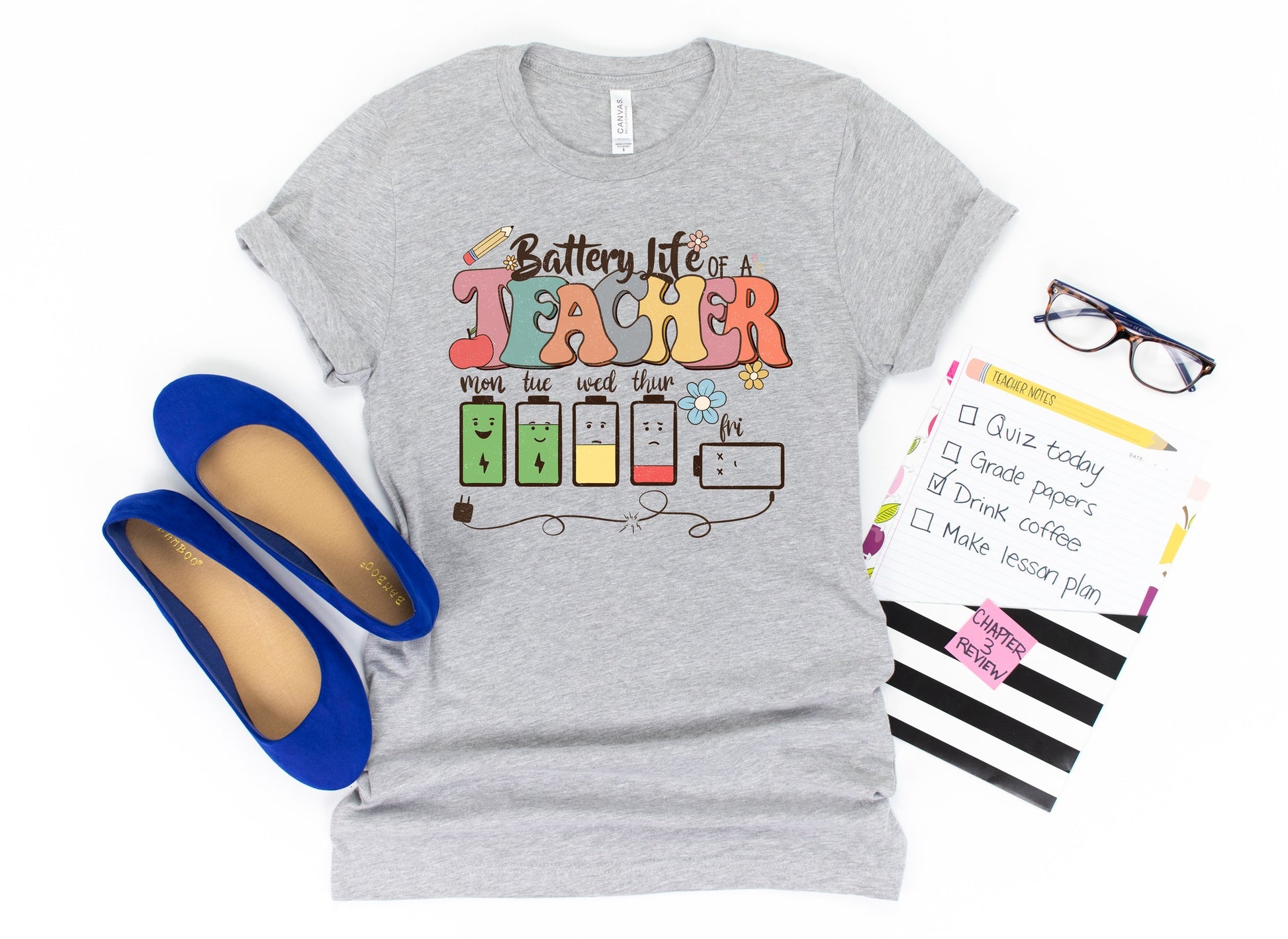 Is your battery life always running on empty? Show your teacher friends you feel their pain with this fun graphic tee! With its unique Battery Life of a Teacher design, you'll make everyone "charge" with laughter!