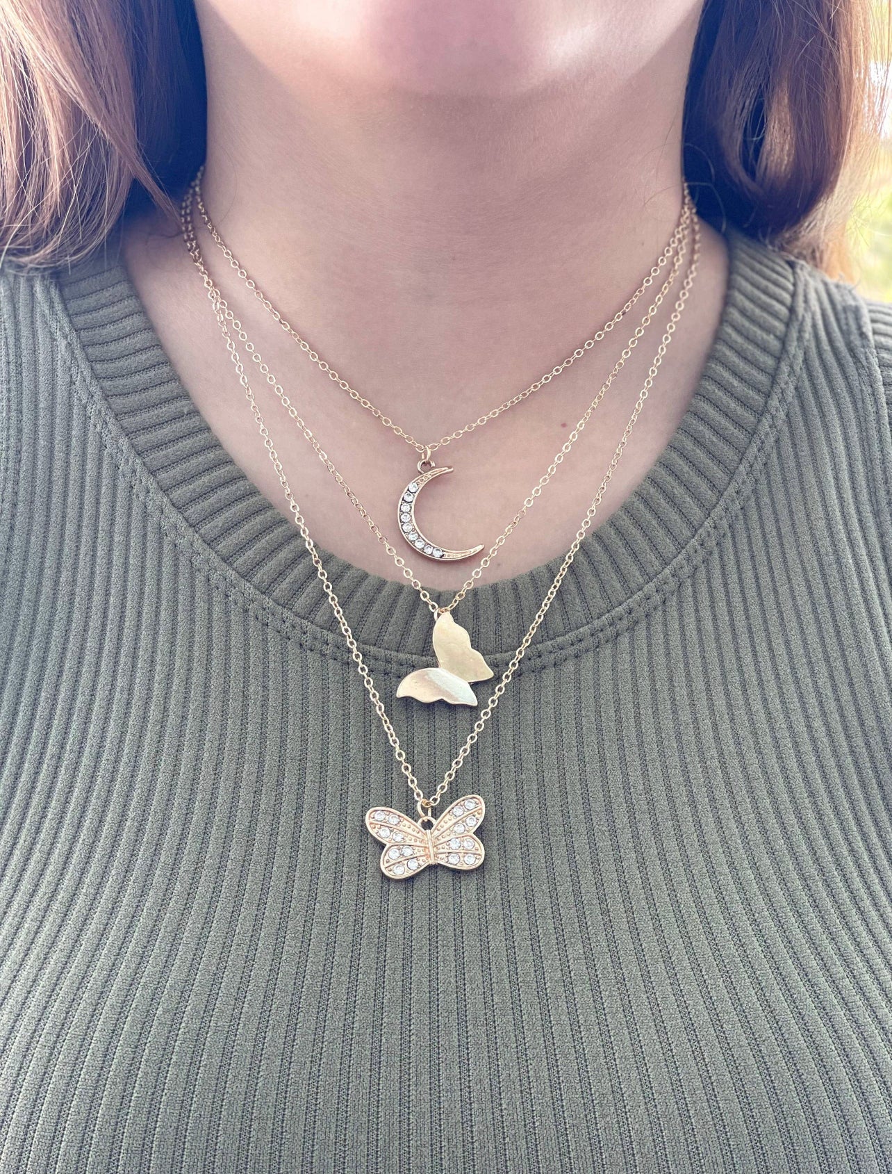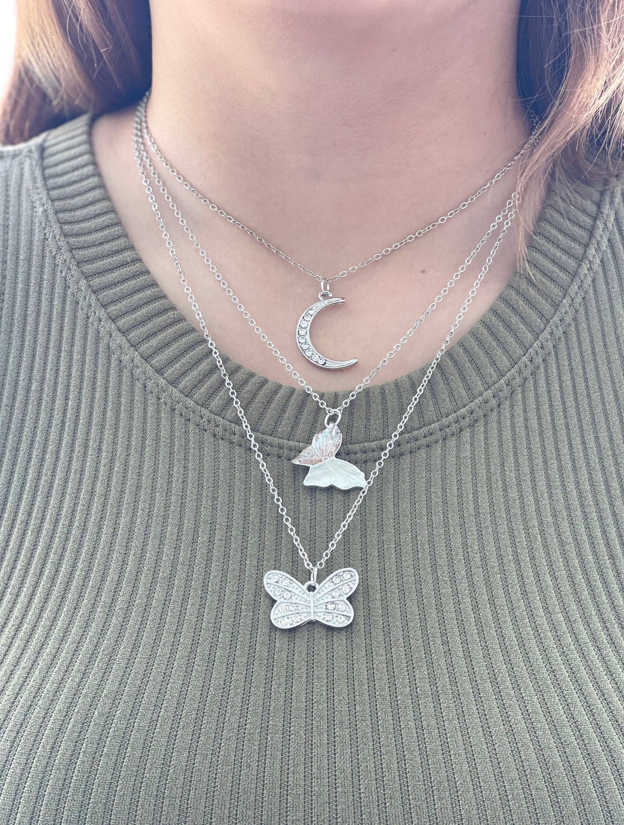 Be the life of the garden party with our Butterfly In The Sky necklace! A triple-layer masterpiece, it features two layers of graceful butterflies and one luna-tic moon layer, available in both silver and gold. Transform yourself into a celestial beauty like no other!