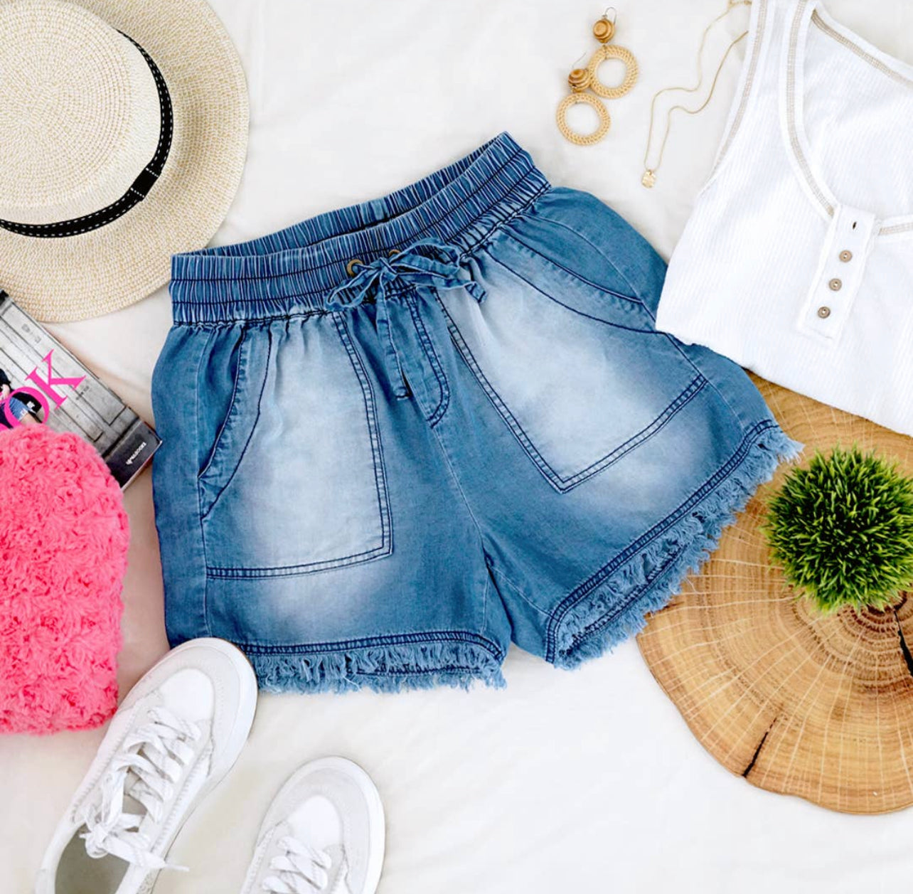 Fun in the sun! Our Chambray Frayed Hem Shorts w/ Pockets are the perfect way to welcome the new season. Featuring a drawstring elastic waist, you'll be all set for a day of chillin' with some sneakers, a tank, and a baseball cap! You can't go wrong with these cool-and-casual shorts!