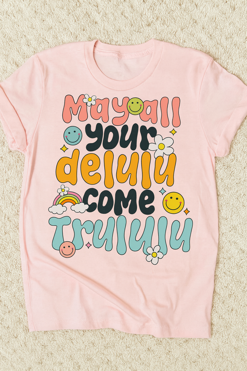 Let your delusions come true with Delulu Trululu! This quirky t-shirt is perfect for anyone who doesn't take themselves too seriously. Embrace your wild imagination and stand out with this unique design. (Warning: may cause excessive daydreaming).
