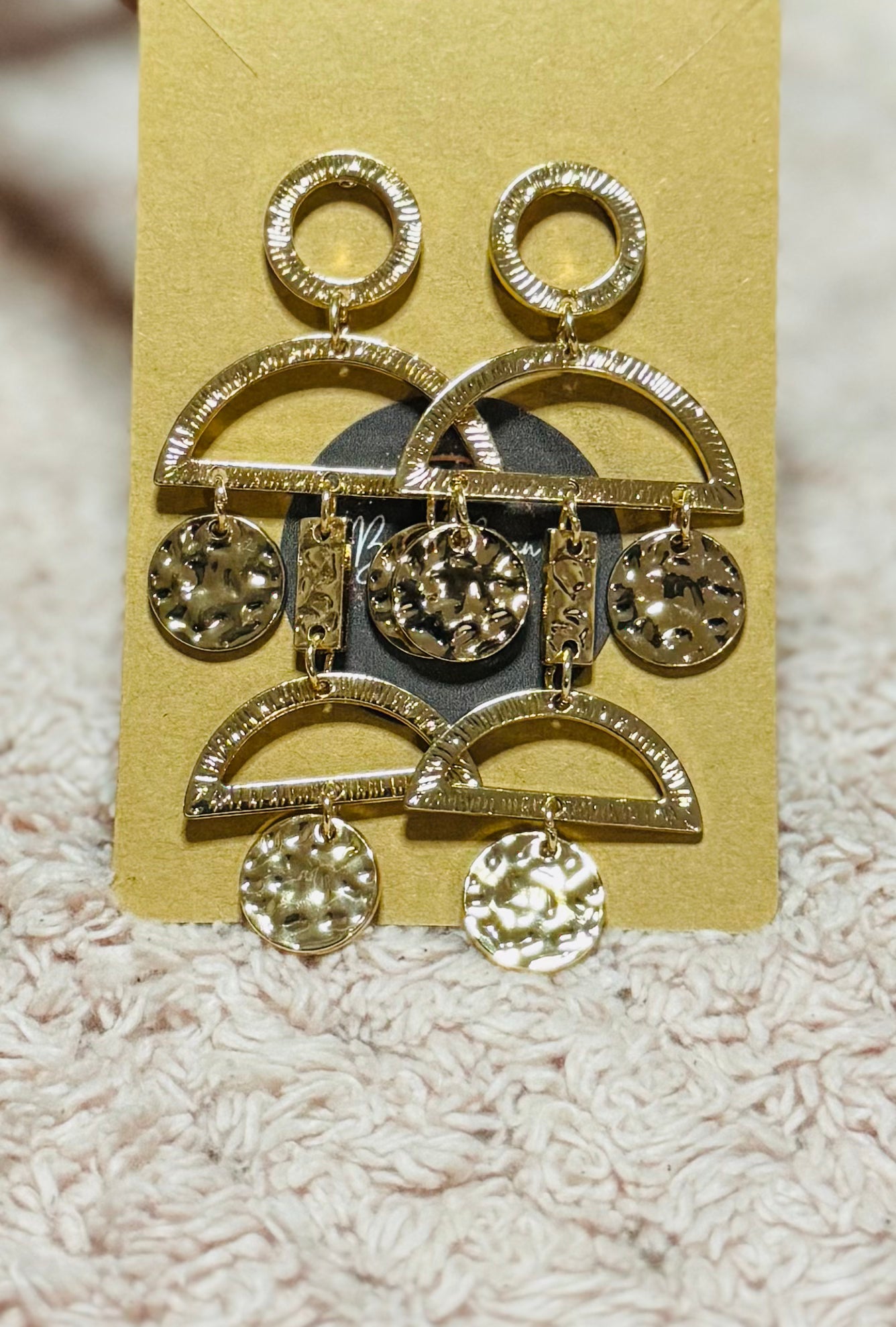 Make a bold yet elegant statement with our Golden Horizon Earrings. These stunning geometric post-back earrings feature a modern blend of textured half-moon and hammered circle charms in radiant gold. Lightweight and eye-catching, they pair perfectly with both casual and dressy looks—adding just the right touch of shimmer to elevate your style.
