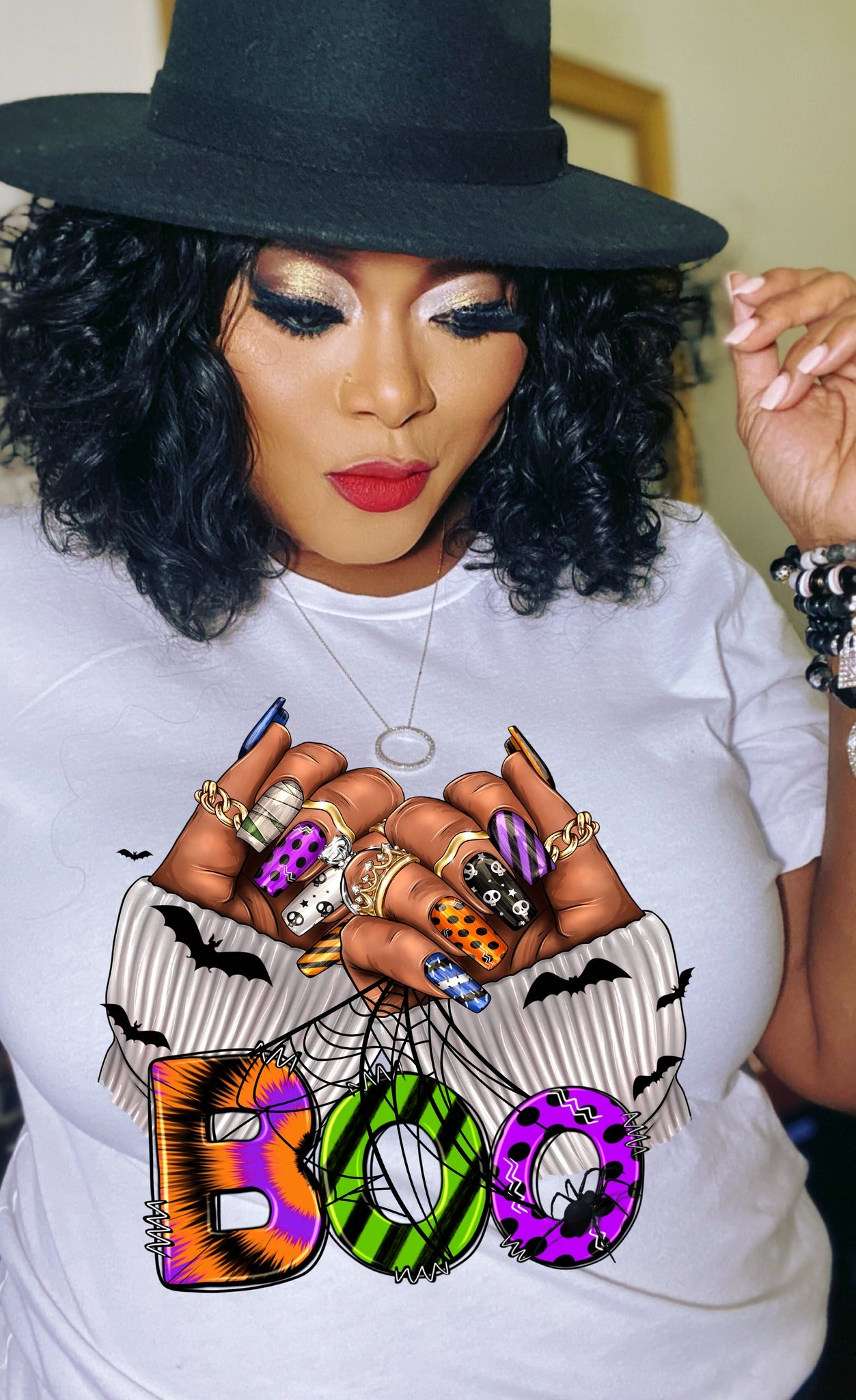 Show off your spooky style with this Halloween Boo Nails graphic tee! Perfect for your Halloween wardrobe, it lets you express your love of the holiday in a fashionable way. Don't be scared to make a statement - let these boo nails add a touch of mystery to your look!
