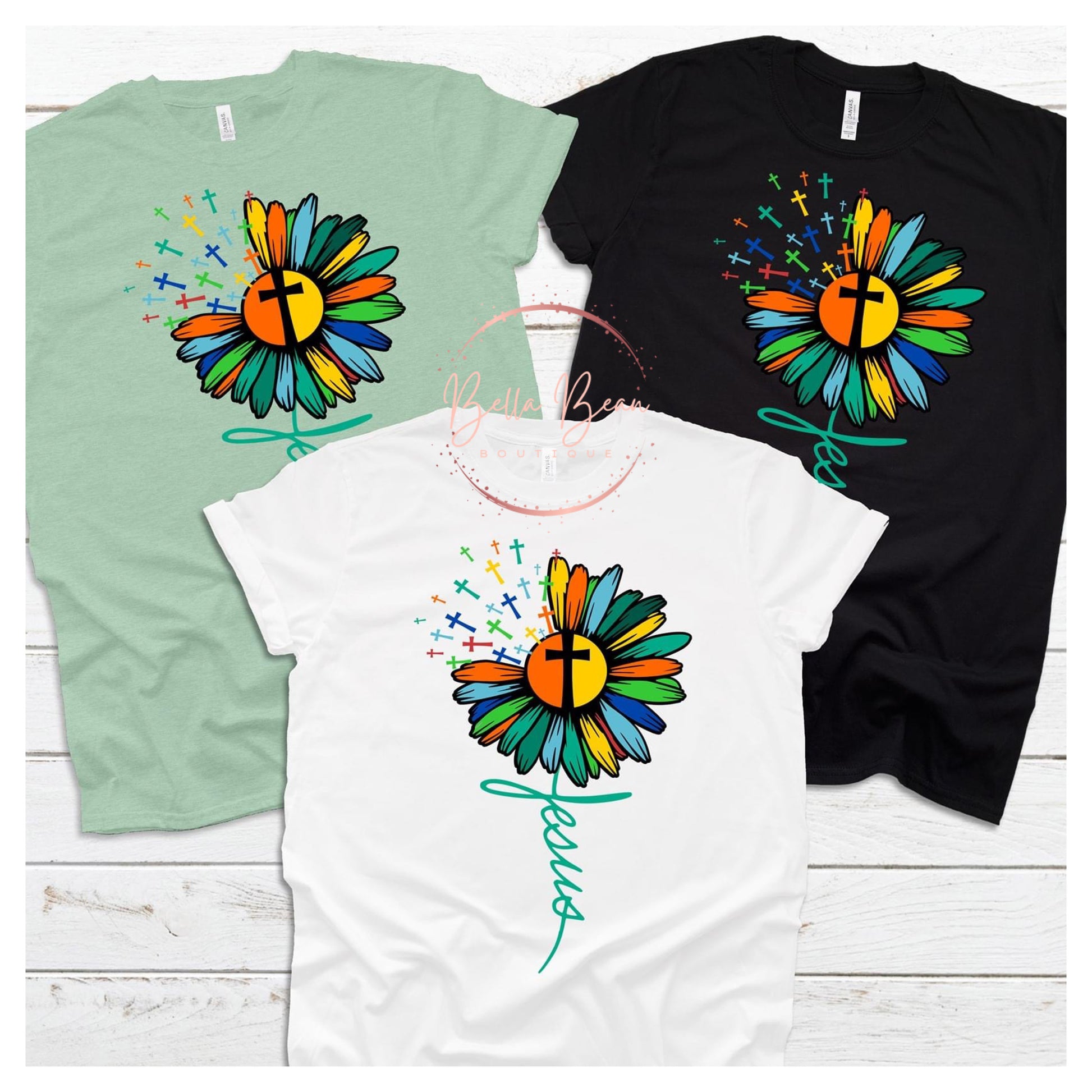 This exclusive Jesus Flower Cross graphic tee exudes faith and style. The striking religious motif of Jesus surrounded by charming blooms creates an elegant and tasteful visual that will make a meaningful statement of your deeply held beliefs.
