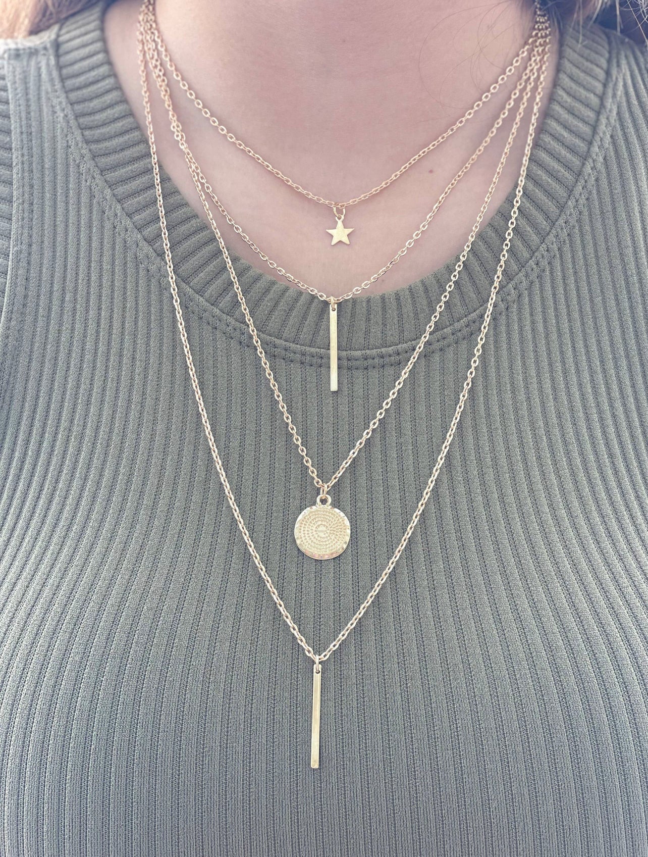 Stand out from the crowd and “Look Up” with this unique necklace! Perfectly blended with 4 stylish layers, this piece features a sparkly star, two sleek bars pendant, and a gorgeous disc - sure to take your outfit from 0 to 100 real quick!