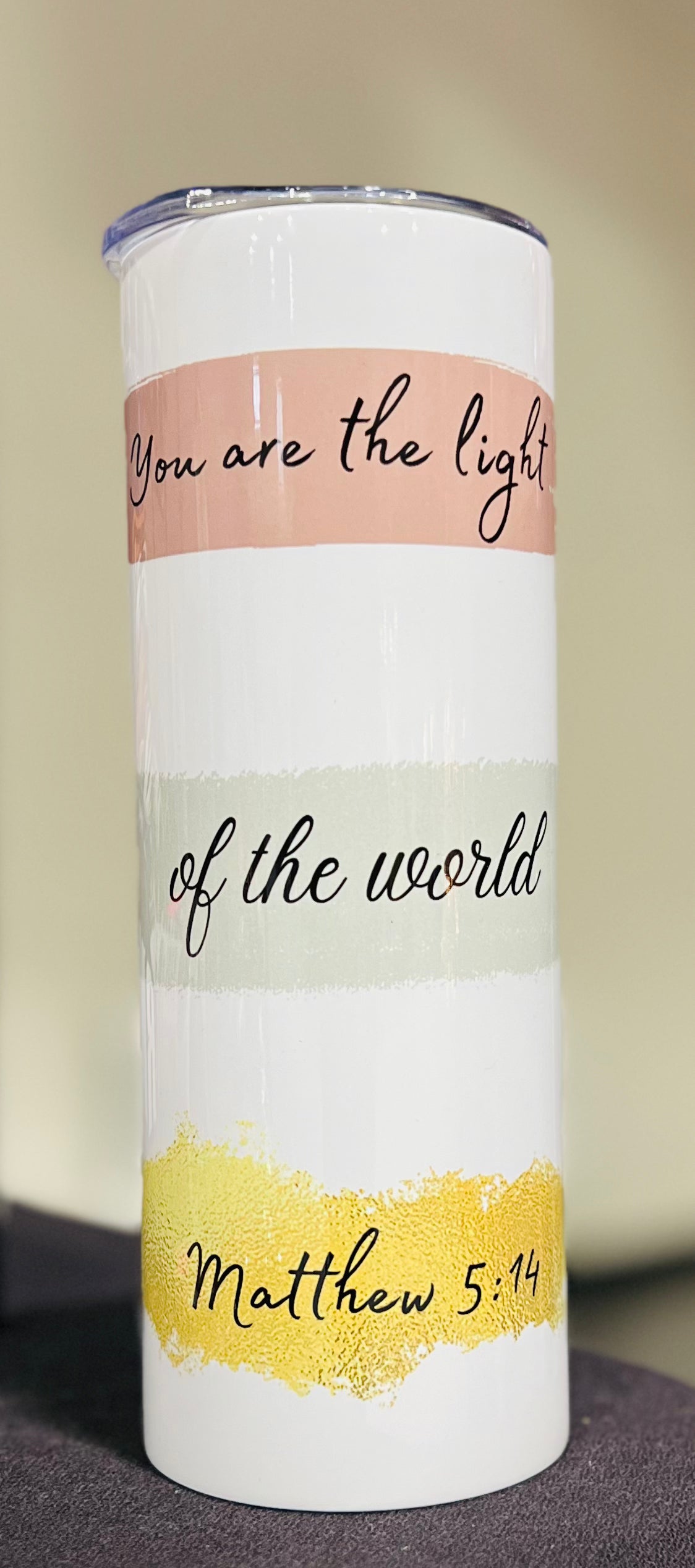 Share the hope of Matthew 5:14 with this inspirational tumbler. Featuring the iconic Bible verse, this tumbler is perfect for a small reminder of faith in everyday life. Light up your day with the uplifting reminder of this timeless message.