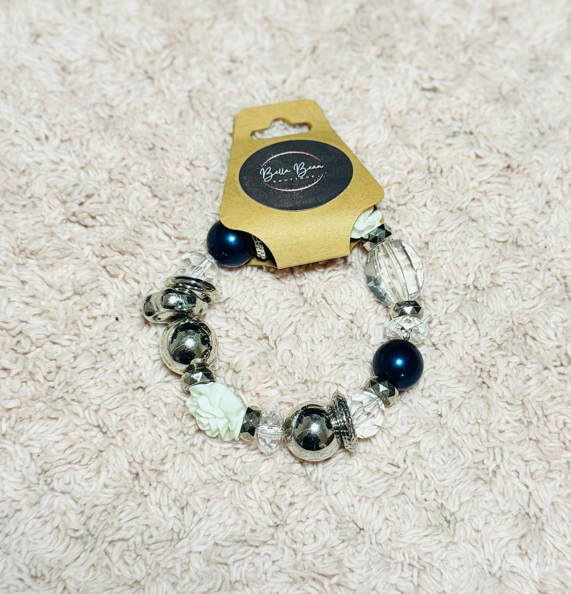 Sophisticated and chic, our Midnight Elegance bracelet features a stunning mix of deep navy pearls, silver metallic beads, and crystal-clear accents. A delicate white rose bead adds a soft, feminine touch to the bold design. The stretch fit ensures comfort and ease, making it the perfect statement piece for both everyday wear and special occasions.