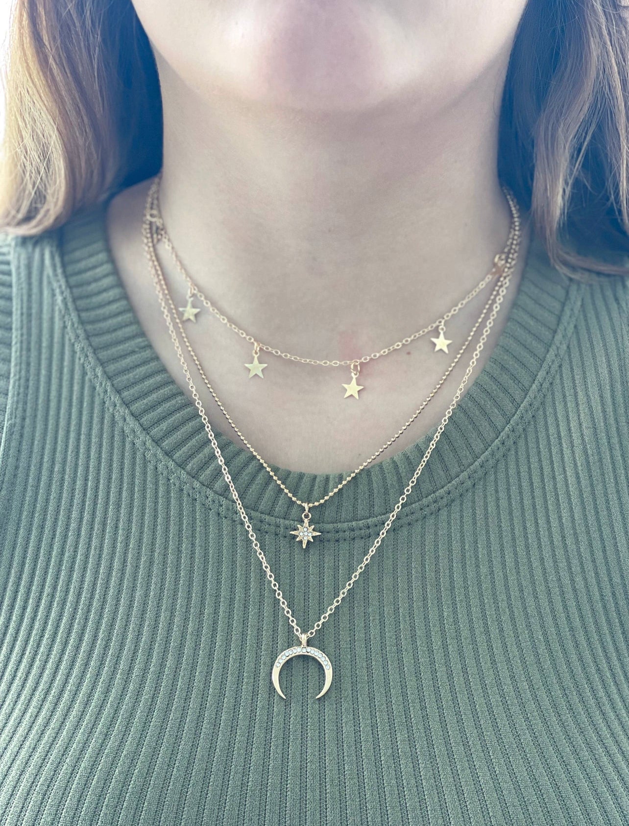 Gaze at the night sky like never before with our Moon and Star Gazing necklace! Our three layered necklace boasts a crescent moon and twinkling stars, shining with celestial beauty. Put it on and feel like a star!