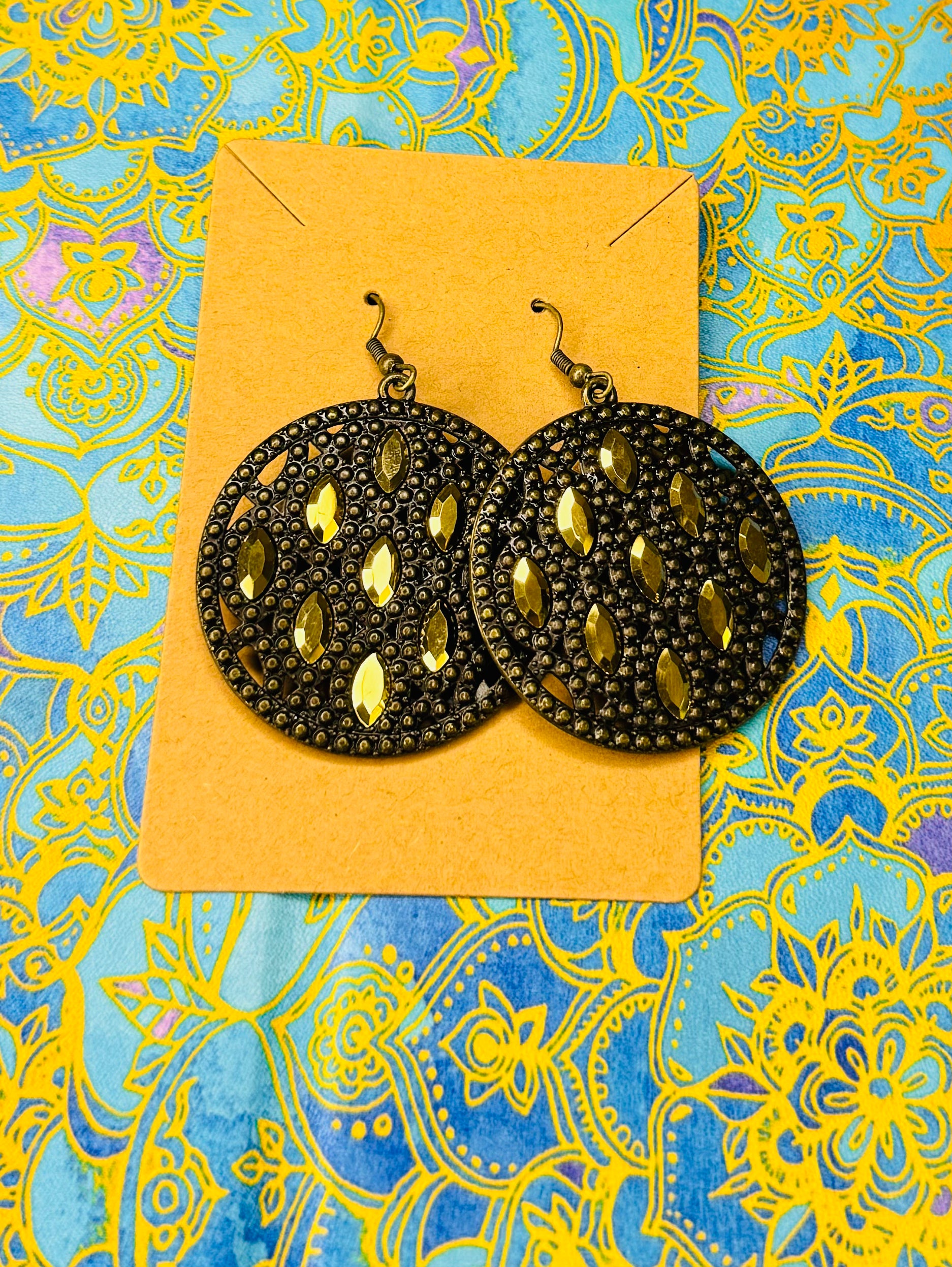 Catch some attention with Once In A Medallion's brass fish-hook earrings, complete with stunning brass gem stones. These earrings are sure to add some sparkle and unique charm to any outfit!