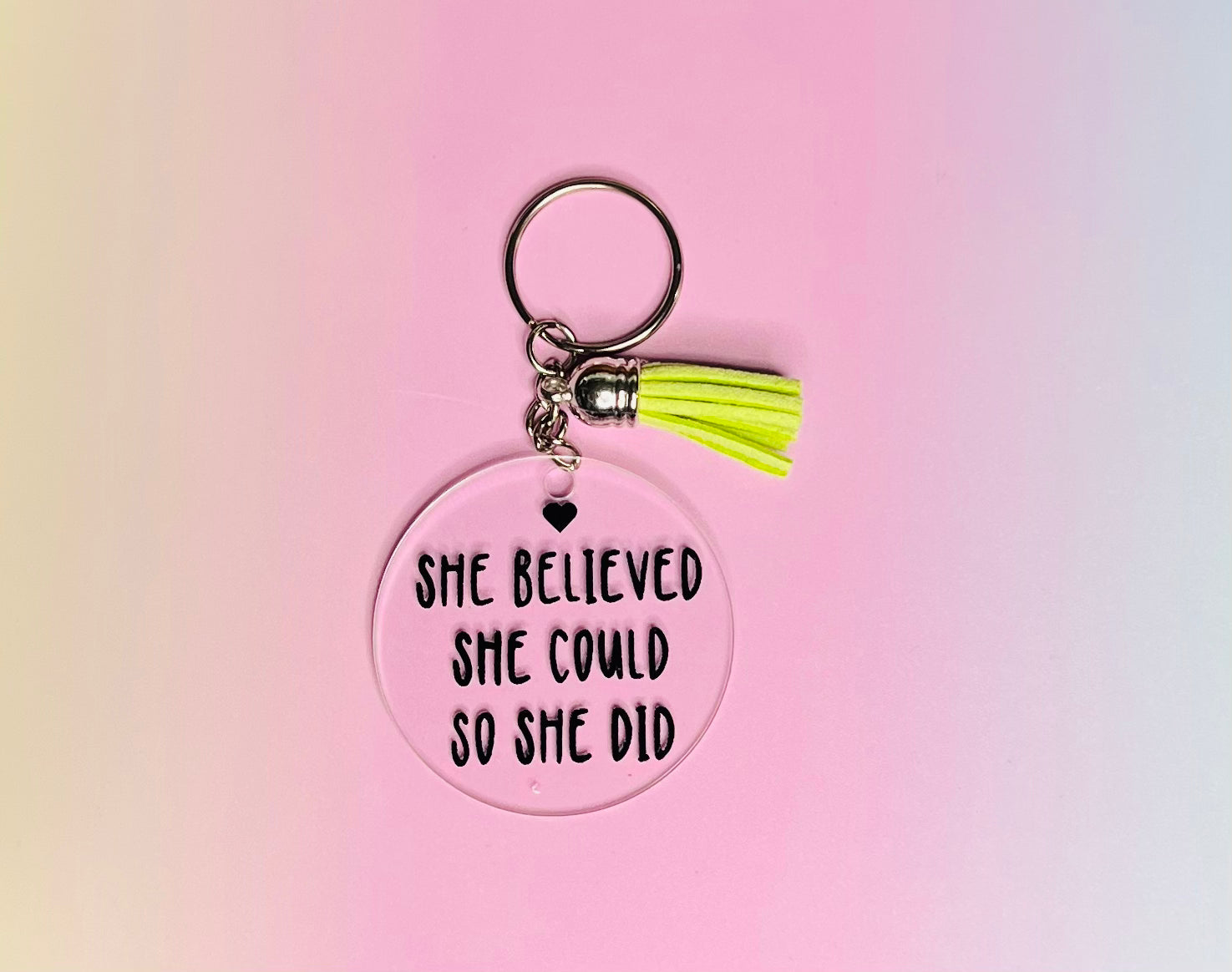 Be inspired with this "She Believed She Could So She Did" keychain. Available in your choice of color tassel, it's the perfect accessory to keep you motivated and believing in yourself! So go out and show the world you can do anything you set your mind to!!!