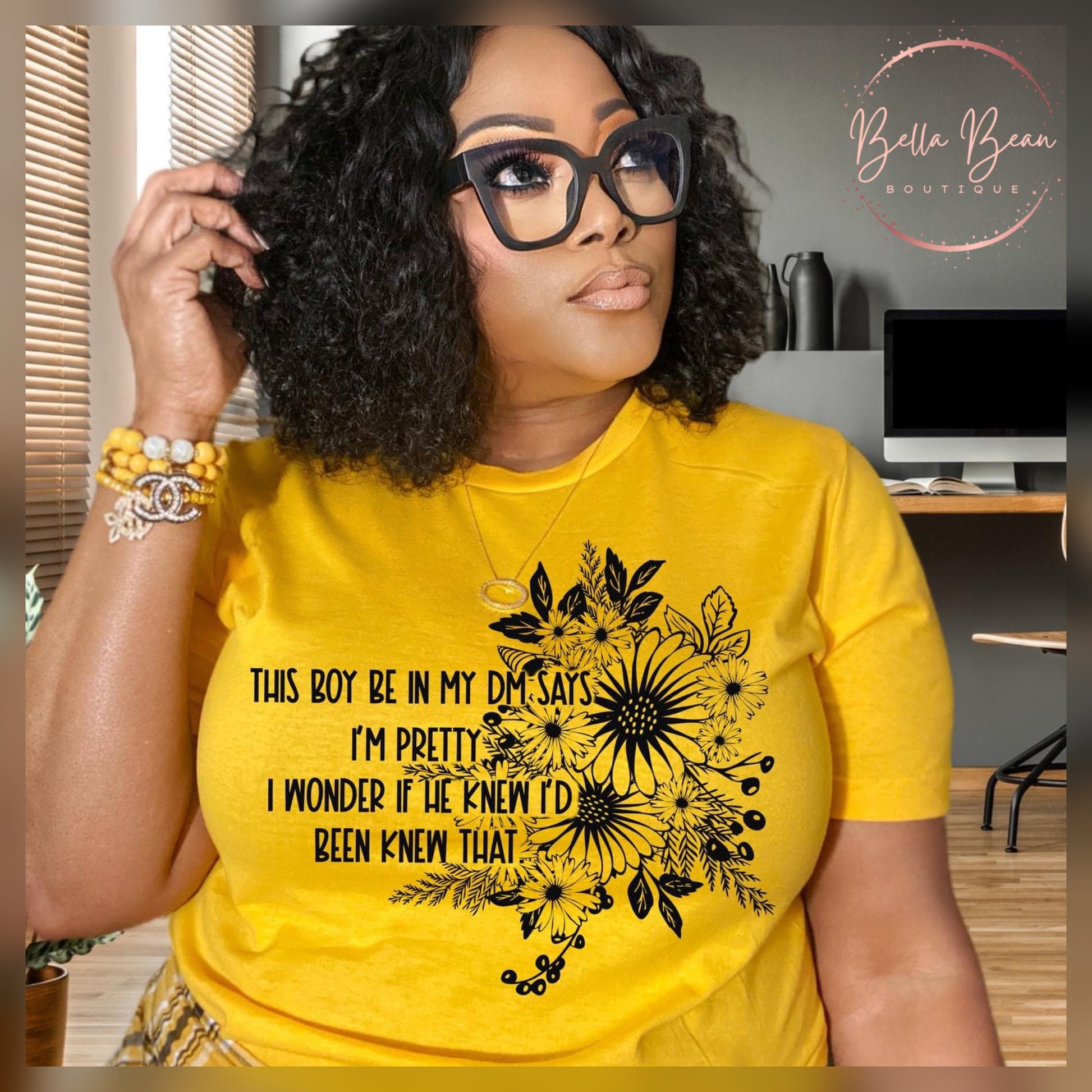 Slide into style and show off your flirty side with This Boy Be In My DM tee. Perfect for catching the attention of those cute boys in your DMs. Don't miss your chance!