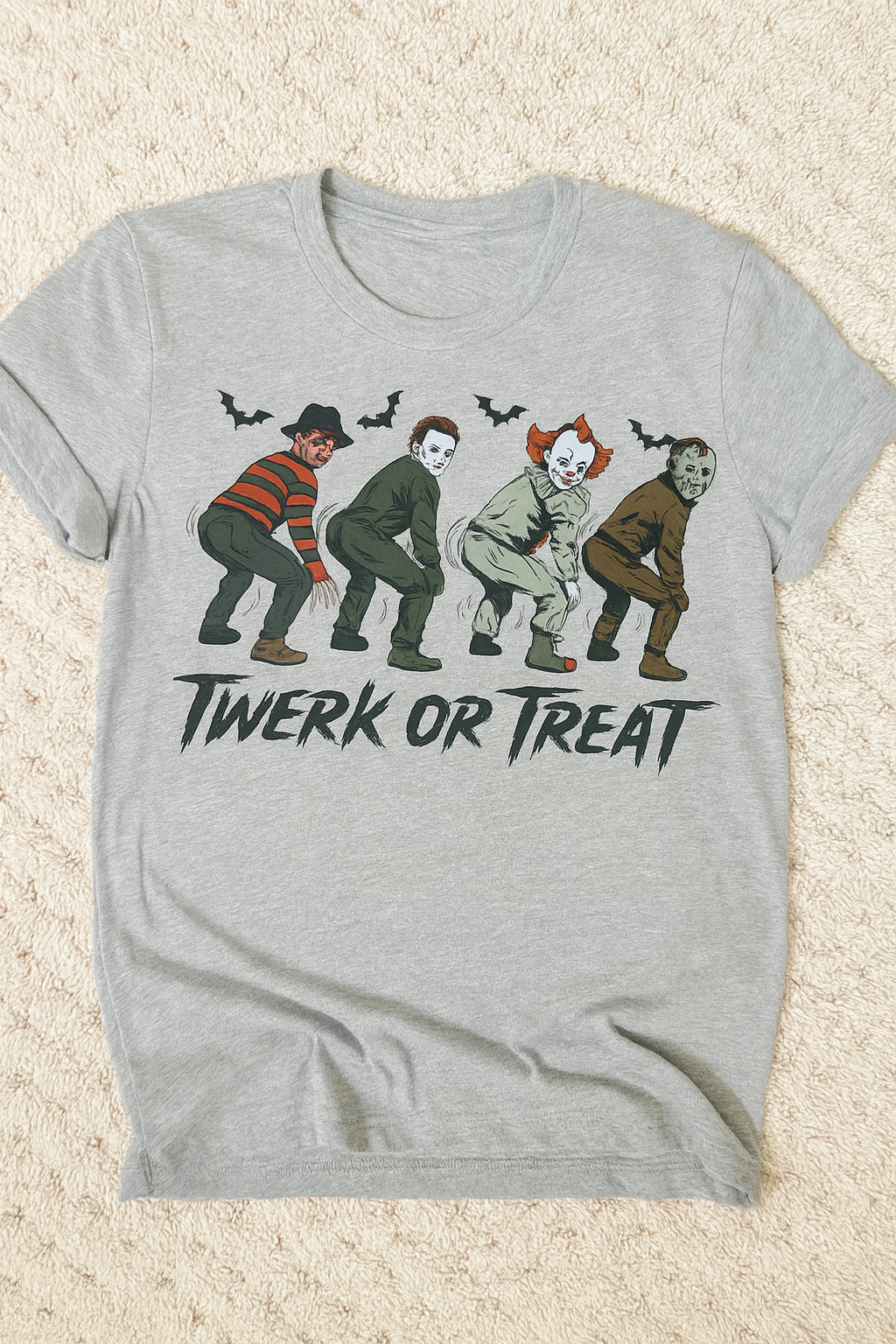 Unleash your wild side with Twerk or Treat! This Halloween, show off your fearless dancing skills and rock this t-shirt. A perfect fit for those who dare to take risks and stand out from the crowd. Get ready to twerk, and let the treat be a bold new adventure!