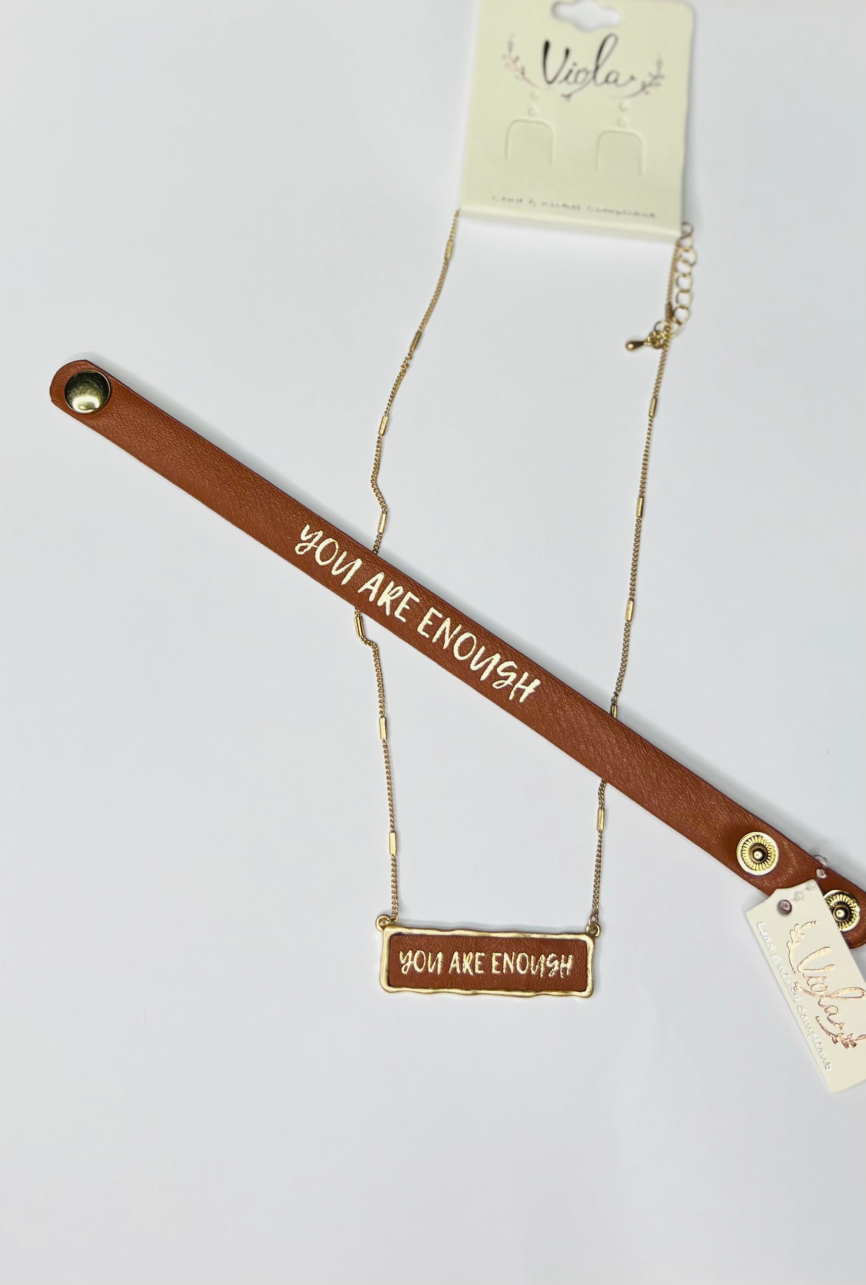 Make a statement with this striking "You Are Enough" set. The perfect reminder for yourself or someone special, this two-piece combo of a necklace and wrap bracelet will show style and inspire confidence! Make a bold statement with this eye-catching red set!